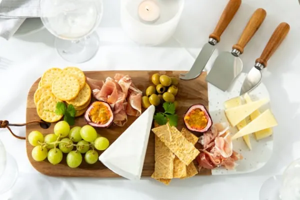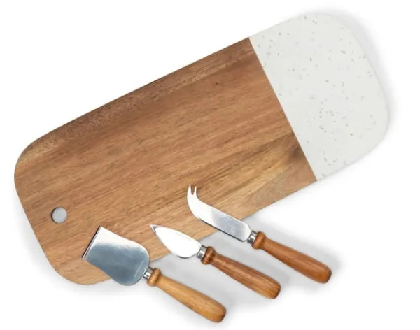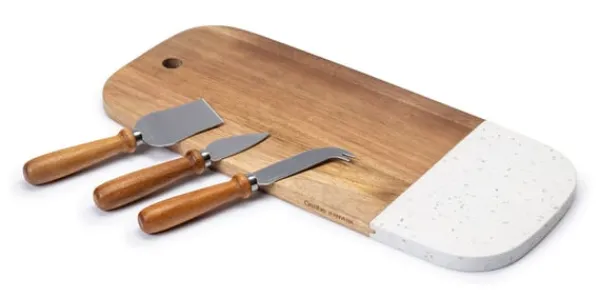 Lyxig ostbricka i akaciaträ och trendig terrazzo tillsammans tre tillhörande ostknivar med matchande handtag. Det eleganta setet blir en fin detalj på bordet och passar utmärkt till olika sorters ostar och charkuterier. När brickan inte används blir den en fin inredningsdetalj på en krok i köket.