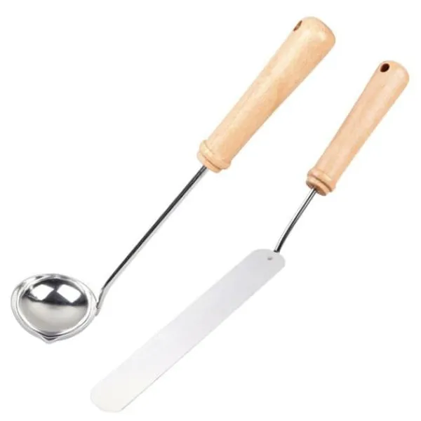 Pannkaksslev och spatel är nödvändigt för en lyckad pannkakskväll! Dessa 2 redskap är gjorda av rostfritt stål med ett handtag av lackerat bokträ. Mått på sleven: 30 x 6 x 5,5 cm. Spatelmått: 35 x 4,5 x 3,3 cm. Tillverkning: Frankrike.