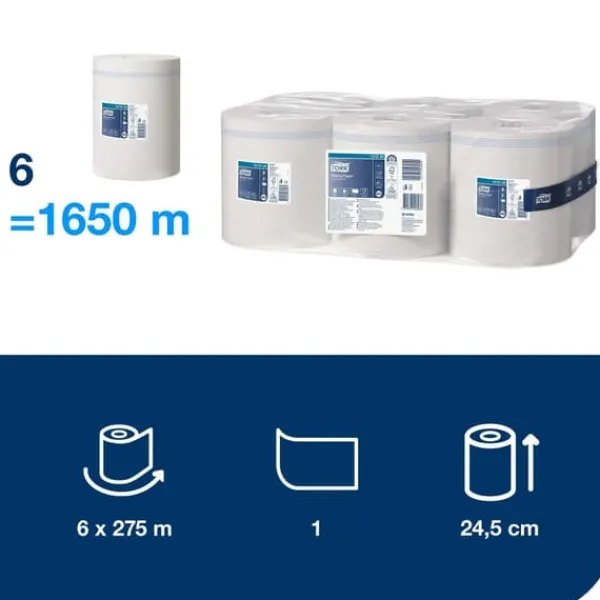 Använd det med Tork Dispenser Centrummatad med hög kapacitet för enkel enhandsutmatning, vilket kommer att göra personalen effektivare. Tork slutindikator hjälper till att visa när det är dags att byta rullar och förhindrar oönskade avbrott i personalens arbetsflöde.