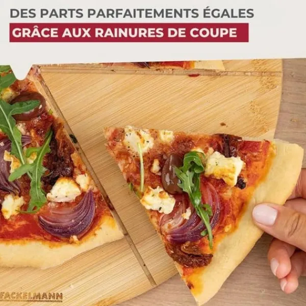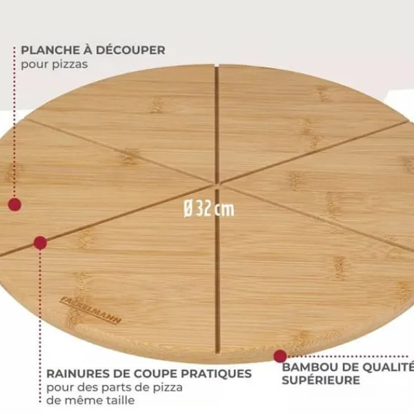 Plusprodukt: 2 FSC™ bambu pizzabrädor Ø32 cm; spår för att skära 6 skivor; användarvänligt och attraktivt; smaklöst material.