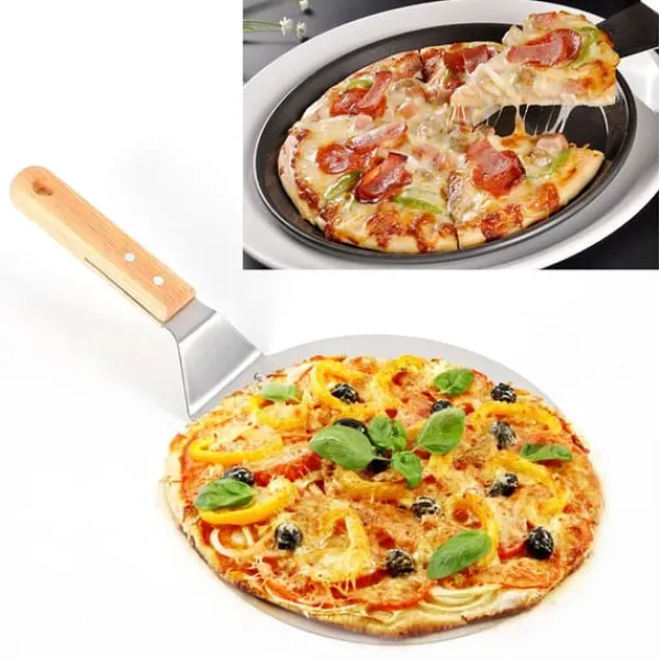 Stadig pizzaspade i rostfritt stål – säker hantering från ugn till tallrik Denna silverfärgade pizzaspade i rostfritt stål gör det enkelt att lyfta, föra och servera pizza, bröd, kakor och pajer. Den släta, robusta ytan låter pizzan glida smidigt utan att förstöra toppingen.