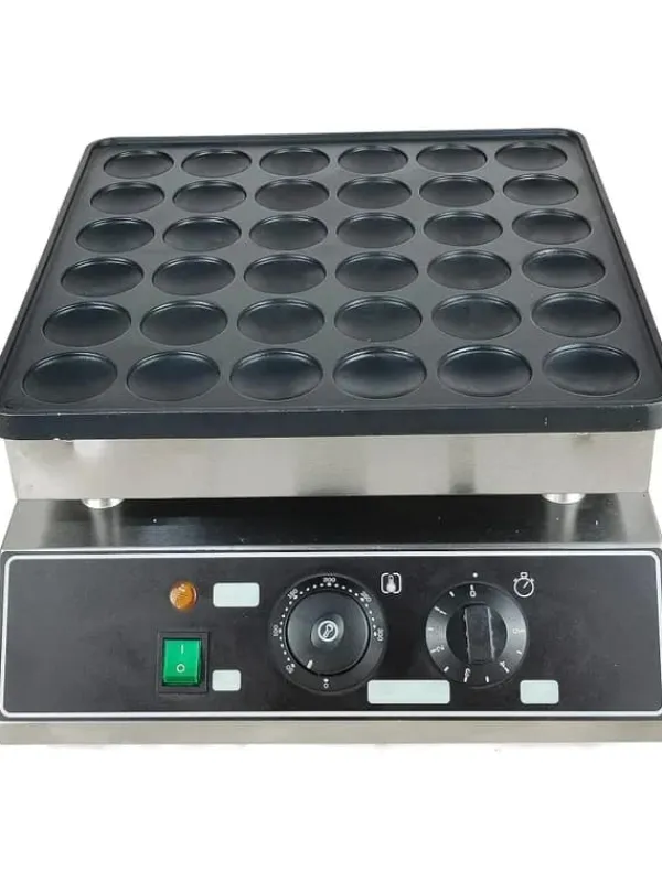 Professionell pannkaks-/våffelmaskin i rostfritt stålKraftfull maskin som levererar små, runda våfflor med jämn gräddning. Hölje i rostfritt stål och aluminiumformar med nonstick-beläggning ger enkel rengöring, hög hållbarhet och stabil prestanda för kök, café eller catering.