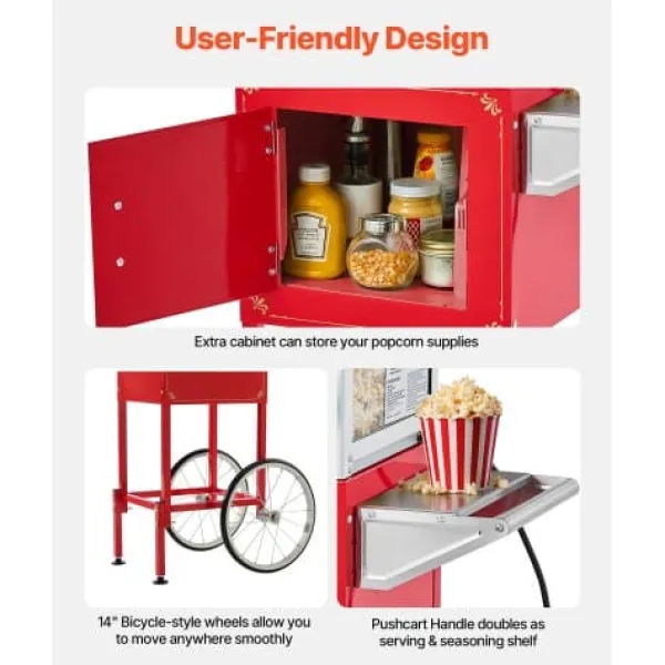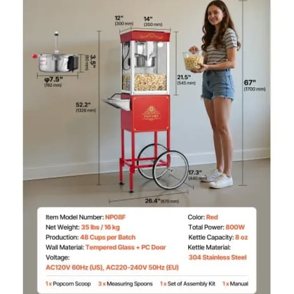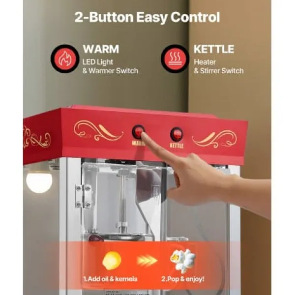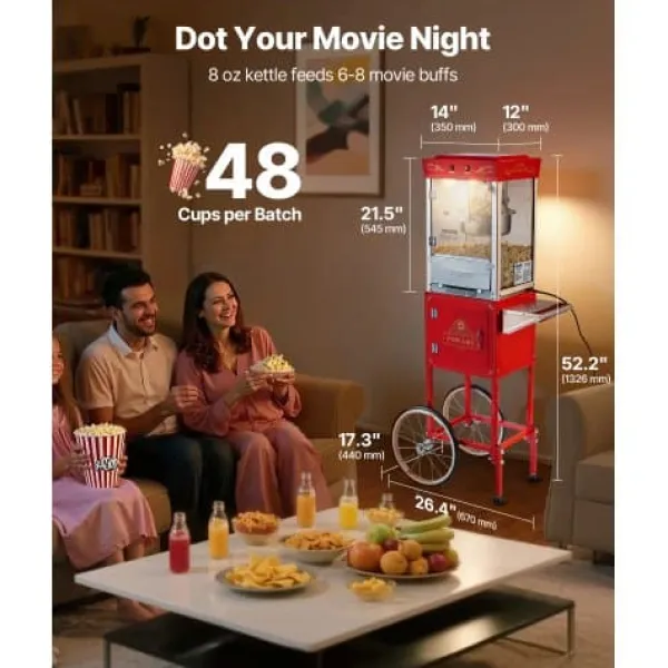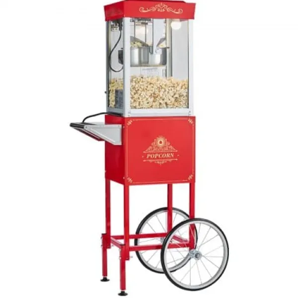 Ta med spänningen från biografen hem eller till ditt evenemang med denna retroinspirerade popcornmaskin på vagn, perfekt för att servera stora grupper färsk, läcker popcorn. Designad för enkel användning och rengöring, har den en hållbar konstruktion och praktisk förvaring, vilket gör den idealisk för fester, sammankomster eller kommersiellt bruk. Njut av popcorn i professionell kvalitet med anpassningsbar kryddning och en värmeplatta som håller varje omgång krispig.