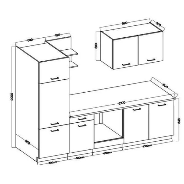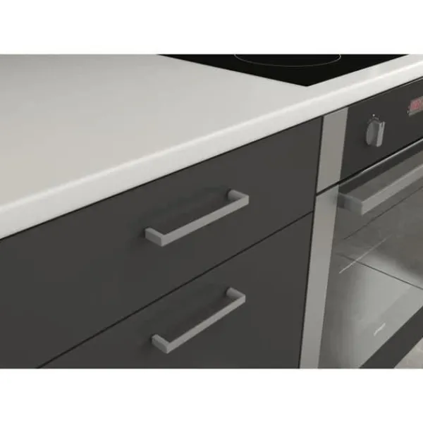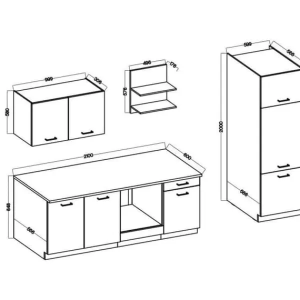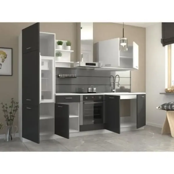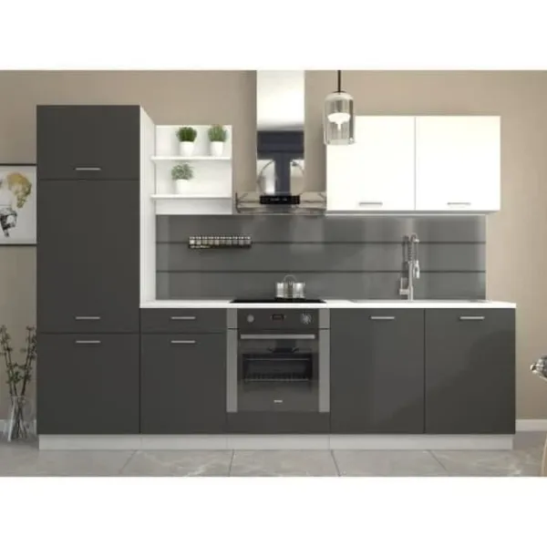 Det kompletta köket PREGO GRAPHIT på 270 cm består av en 210 cm basenhet (under diskbänk + ugnsplats + 1 låda / 1 dörr), en 100 cm hög enhet, en 50 cm hylla och en pelare på 60 x 200 cm (möjlighet till installation av ett kylskåp, maxmått 485 x 882 mm). Bänkskivan 210 x 60 cm ingår. Färg: Graphit Grey.