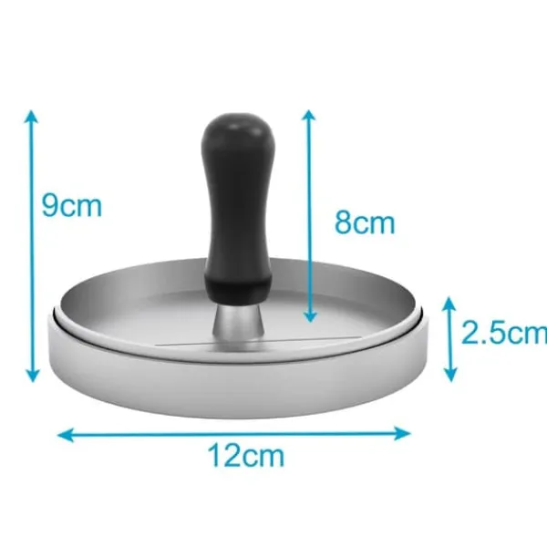 Pressen har en diameter på 11,5 cm och är tillverkad av grå aluminiumlegering och ett handtag av PP-plast.