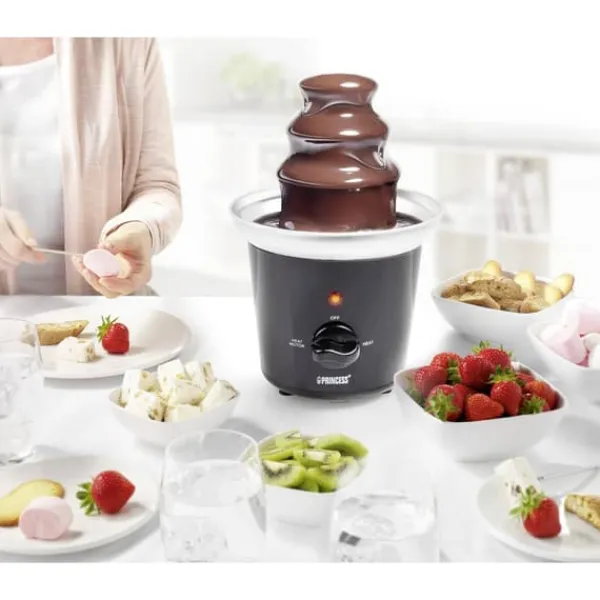 Princess 292994 Schoko-brunn är den perfekta apparaten för alla chokladälskare. Överraska dina barn på födelsedagsfesten eller skäm bort din partner på alla hjärtans dag. Brunnen smälter chokladen och pumpar den uppåt, där den sedan flyter ner över tre nivåer. Njut av att kunna dyka ned olika livsmedel som fruktstycken, kex och marshmallows i den söta chokladströmmen.Enkel att användaPrincess chokladfontänen är enkel att använda. Ge fint raka chokladkakor i droppskålen och sätt vridreglaget i första läget. När chokladen har smält kan du ställa in vridreglaget i det andra läget. Sedan strömmar den ut ovanifrån och skapar ett vattenfall av smält choklad. Tack vare uppvärmningsfunktionen i Schoko-Brunnen behöver du inte smälta chokladen i vattenbad.Konstant temperaturVärmeelementet håller chokladens temperatur konstant, så att det förblir flytande och inte brinner. För en perfekt chokladkaka måste du eventuellt lägga till något kakaosmör eller tesked olja till chokladen. På så sätt kan alla njuta av den ultimata chokladfontänen.Använd färska frukter, kex och marshmallowsKomplettera alla fester med Princess Schoko-brunnar. Förbered tallrikar med fräscha frukter, kex och marshmallows och låt alla dippa. Du kan även använda Schoko-brunnen om du serverar pannkakor, så att alla kan använda chokladkakan från brunnen. Alla era söta drömmar kommer att bli verklighet.Enkel att rengöraEfter användning häller du helt enkelt ut resten av chokladen ur brunnen i en mindre behållare och låt den svalna. Toppen av fontänen kan tas bort och kan enkelt spolas av. Uppfångsskålen av rostfritt stål kan rengöras med ett diskmedel utan problem. Princess chokladfontänen kan enkelt rengöras och tack vare sin kompakta storlek även enkelt ställas undan. OBS! Vi beklagar att vi inte har hunnit översätta denna produkttext. Texten nedan är maskinöversatt från tyska.