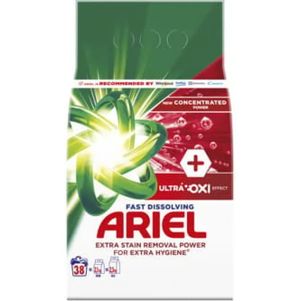 Ariel, ett varumärke som rekommenderas av Whirlpool, Electrolux, Candy och Beko, presenterar Ariel +Ultra OXI Effect snabbt upplösande tvättpulver och tvättmedel. Den nya koncentrerade formulan för Ariel tvättpulver ger mer rengöringskraft, så att en förpackning räcker till fler tvättar. Ariel +Ultra Oxi Effect ger bättre fläckborttagningskraft för extra hygien (jämfört med Ariel Mountain Spring tvättpulver) och utmärkta tvättresultat, även vid låga temperaturer. Tack vare unik teknik löses pulvret omedelbart upp i vatten, aktiveras omedelbart och tränger djupt in i fibrerna, även vid låga temperaturer. Sänk tvätttemperaturen till 30 °C, vilket sparar upp till 60 % energi. (Tvättmaskinens energiförbrukning, sänkning av temperaturen från 60 °C till 30 °C, standardprogram). Tvättning vid låga temperaturer skyddar tyger längre än tvättning i varmt vatten. Formeln innehåller biologiskt nedbrytbara ingredienser (80 % av alla ekologiska ingredienser är biologiskt nedbrytbara). Dessutom är förpackningen för tvättmedlet Ariel +Ultra OXI Effect 100 % återvinningsbar.