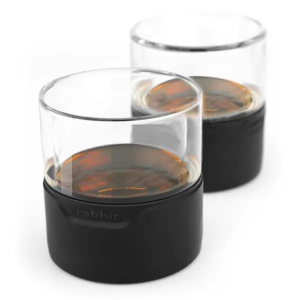 Med Rabbit® Whiskey glas, är isen utanför din dryck, inte i den. Glasen kommer att kyla din drink ner till precis över fryspunkten och kommer att hålla det kylda i upp till två timmar. En bas av slikon verkar som ett inbyggt underlägg. Silionsidorna skyddar även dina händer från kylan.