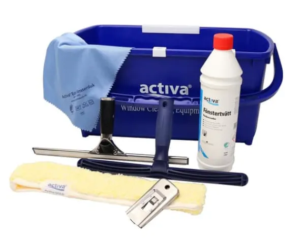 Innehåller: Activa Fönserputshink 18L, Activa Fönstertvätt, klickskrapa Lightweight, Activa Fönsterduk 40x50cm, Activa Pälshållare 35cm, Activa Gold Tvättpäls 35cm, Ettore Handtag Quick Release, Ettore Skena i mässing 35cm.