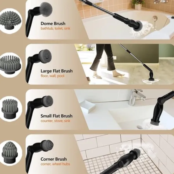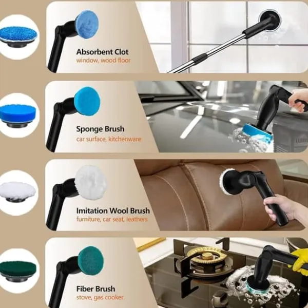 Rengöringsverktyget levereras med 8 utbytbara borsthuvuden för olika användningsområden. Rund borste är idealisk för badkar och badrum, platt borste för golv, kakel och väggar, och svamppads för fönsterputs. Alla borsthuvuden är noggrant utformade för att möta olika rengöringsbehov.