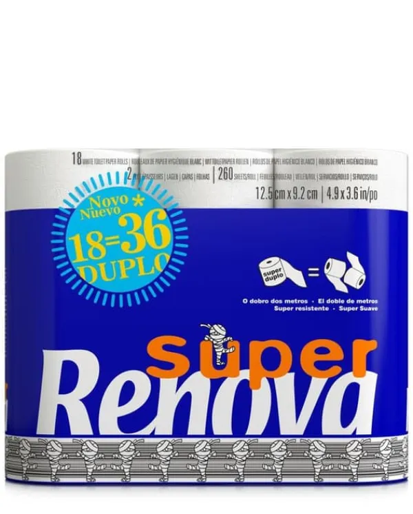 Renova Super Dubbelt Toalettpapper 18 rullar Den klassiska Renova Super har vi alltid känt, med dubbelt så mycket papper och utan att det kräver dubbelt så mycket utrymme! 18 rullar papper motsvarande 36 rullar. Renova Super är en riktig klassiker som många gillar, men som inte låter den lugna sig. Nu återuppfunnet i Super Double-versionen, med dubbelt så långa rullar, mjukare och mer hållbara. Första råvara Vitt papper Kompakt dubbelrulle 1 dubbelrulle = 2 standardrullar Luktfri Mjuk och absorberande 18 rullar per förpackning 260 ark per rulle 32,50 m papper per rulle 2-lagers Dermatologiskt testad Mått på förpackningen: 34,5 x 23,0 x 27,6 cm Tillverkarkod: Renova EAN-kod: 5601028024204 Tillverkningsland: Portugal