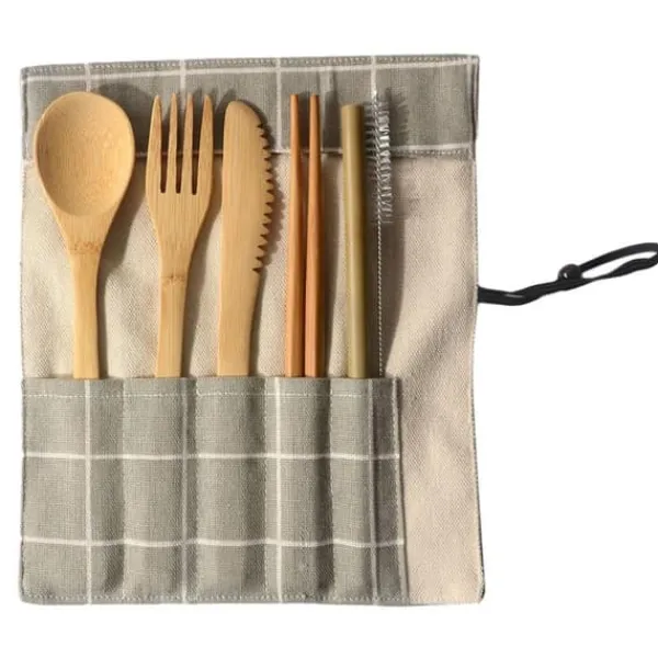 Tacka nej till bräckliga och onödiga plastbestick vid foodtrucken. Dessa resebestick är tillverkade av fullt biologisk nedbrytbar bambu och är såväl starkare som bättre att äta med. Setet innehåller bestick för alla typer av mat; kniv och gaffel, där kniven har ett tandat blad som enkelt skär genom kött, en sked, ätpinnar och ett sugrör. Dessutom får du med en rengöringsborste. Besticken förvaras i ett vackert tygfodral med spänne.