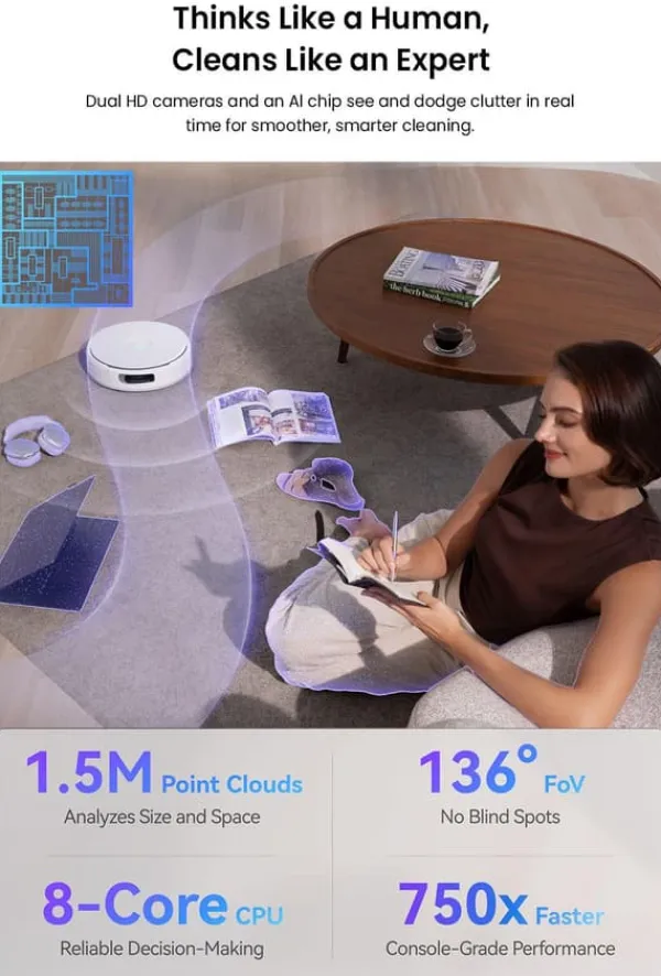 Detektering med dubbla kameror + branschledande 10 TOPS-datorkraft ”Smartare och närmare än någonsin!” Upplev nästa generations noggrannhet med TwinAI vision, som säkerställer ultraexakt kartläggning och undvikande av hinder. Baserat på 10 TOPS kantberäkningar upptäcker enheten 200+ objekt i realtid, vilket säkerställer smartare och smidigare navigering.