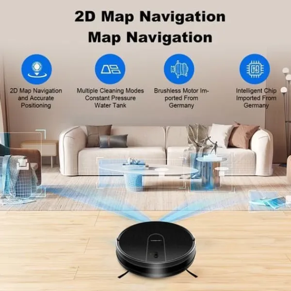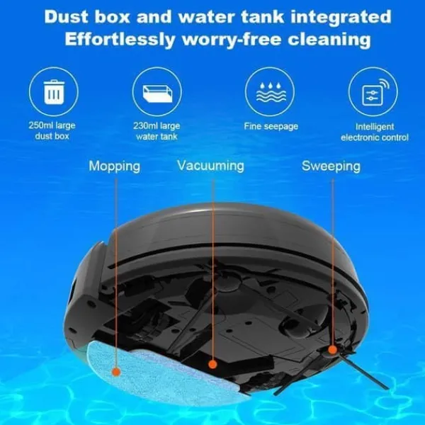 Intelligent och enkel kontroll: Du kan välja hur du vill styra: programmera en städning, justera sugkraft, vattenflöde etc. via APP Tuya, styra roboten med röstkommandon via WiFi/Alexa och/eller fjärrkontrollen. (Endast Wi-Fi 2,4 GHz).