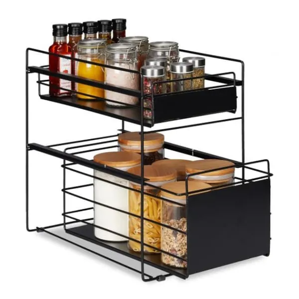 Fristående lådskåp för förvaring och organisering Håll dina tillhörigheter organiserade med detta rymliga lådskåp. Det praktiska utdragbara hyllplanet har två lådor och en öppen design, vilket håller viktiga saker inom räckhåll och synliga. Fyll det med förnödenheter, burkar och flaskor i köket. Använd den utdragbara korgen i badrummet för att förvara kosmetika. Detta lådorganisationssystem är lämpligt för många ändamål. Använd det till exempel som en organiserare under diskbänken eller placera det i skåpet för att förvara rengöringsartiklar.
