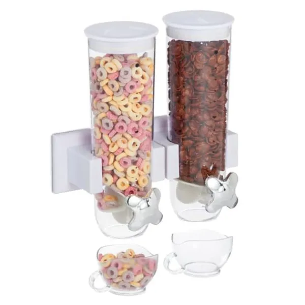 Frukost är känd som dagens viktigaste måltid. Müsli eller cornflakes är särskilt populära. Denna praktiska matdispenser förvarar prydligt två olika typer av flingor, och locken med gummiringar håller dem lufttäta. Hjulet gör det enkelt att dosera och mäta upp innehållet. Cornflakesdispensern kan väggmonteras för en platsbesparande lösning, vilket sparar utrymme på din köksbänk.