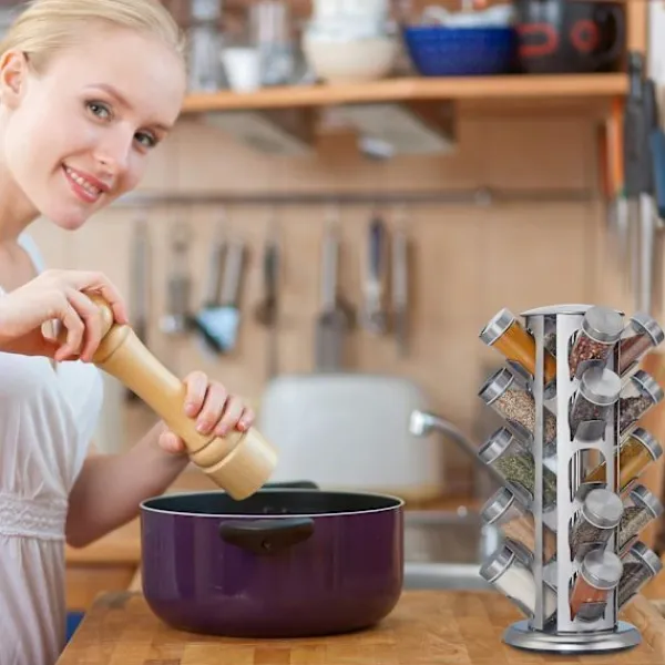 Platsbesparande design: Kompakt design sparar bänkutrymme – en bonus i mindre matlagning utrymmen. Roterande bas gör det enkelt att hitta den krydda du behöver och bevara värdefullt bänkutrymme.