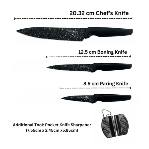 Bladen, sakkunnigt belagda i marmor, skär inte bara; de utför en kulinarisk balett, utan ansträngning skära igenom ingredienser med finess. Varje kniv är ett mästerverk, designat för både funktionalitet och visuell tjusning. De ergonomiska plasthandtagen ger ett bekvämt grepp, vilket säkerställer att varje rörelse i köket utförs med precision och kontroll.