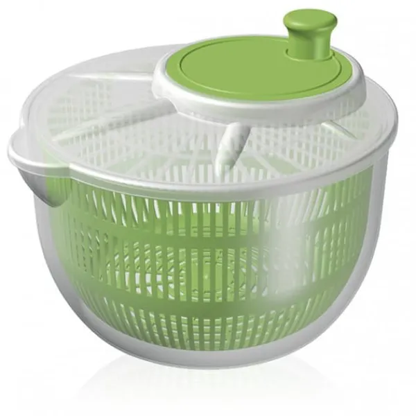 En funktionell anordning för att snabbt centrifugera vatten från tvättad sallad eller andra bladprodukter: spenat, örter, persilja, rucola etc. Spinnerkorgen kan användas som sil för att skölja grönsaker och sila pasta. Behållaren har en tratt för att underlätta avlägsnandet av vatten. Perfekt för snabbtorkande sallad. Enkel och snabb att använda. Höjd: 11 cm Diameter: 19 cm Kapacitet: 2,5 L