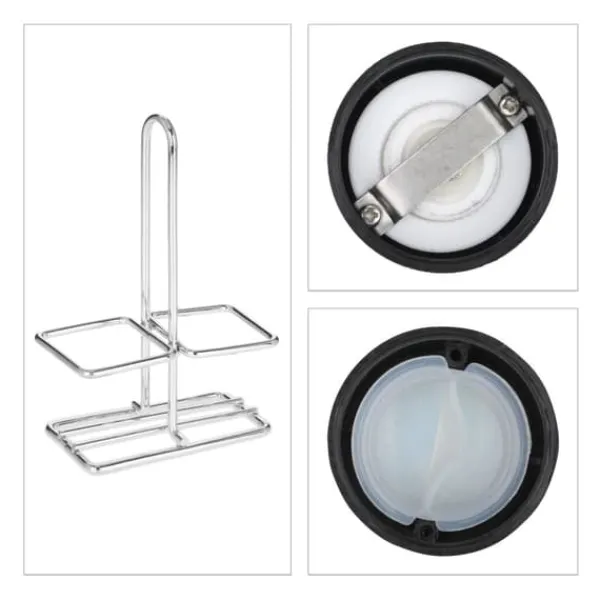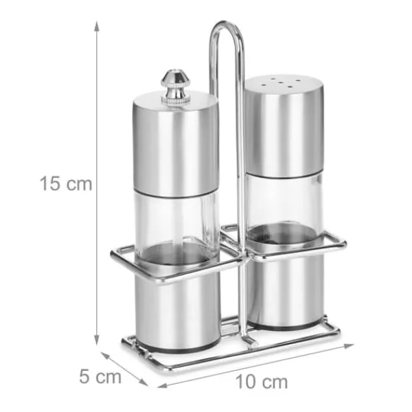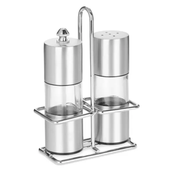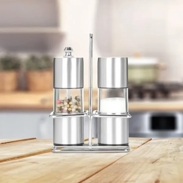 Detta praktiska set med salt- och kryddkvarn är perfekt för alla matbord och gör det enkelt att krydda maten med nymalda eller finmalda kryddor. Setet innehåller en ströare, en kvarn med robust keramisk kvarnverk och ett portabelt ställ för smidig servering och förvaring. Behållarna har ett tydligt fönster och är enkla att fylla på tack vare praktiska skruvlock.