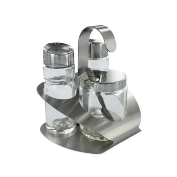BESKRIVNING: Set för salt och peppar samt senap, att placera på bordet. DEN LILLA +: Detta set innehåller 3 delar: en saltströare, en pepparkvarn och en senapsburk. KOMPOSITION: Rostfritt stål, glas.