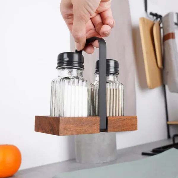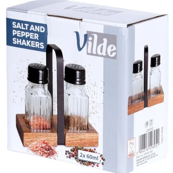 En uppsättning av två behållare bestående av en saltkar och en pepparkar, vilka placeras i ett praktiskt stativ. Tillverkad av slitstarka material. Praktisk dosering säkerställs av hål som förhindrar att för mycket krydda tillsätts. Att dosera kryddor från behållaren är mycket bekvämare än direkt från påsen. En original Vilde-produkt. Tillverkad i enlighet med europeiska standarder.