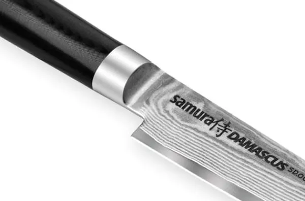 Introducerar Samura Damascus Professionell Japansk Kockkniv, en perfekt blandning av konstnärlighet och funktionalitet, skapad för kulinariska entusiaster och professionella kockar. Med en bladlängd på 125 mm (5 tum) är denna kniv designad för att ge precision och kontroll, vilket gör den till ett oumbärligt verktyg för en mängd olika skäruppgifter i köket. Det slående Damascus-mönstret på bladet förbättrar inte bara dess estetiska tilltal utan symboliserar också den överlägsna kvaliteten på stålet som används i dess konstruktion. Varje kniv är tillverkad med en traditionell smidesprocess, vilket säkerställer exceptionell skärpa och hållbarhet.Bladet på Samura Damascus-kniven har en unik lagerkonstruktion, bestående av hög
