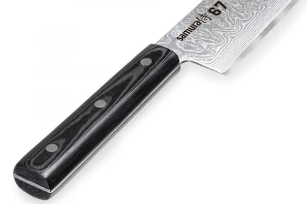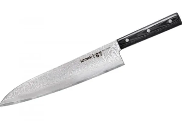 kvalitativt japanskt stål, med imponerande 67 lager rostfritt stål. Denna unika konstruktion förbättrar inte bara knivens estetiska skönhet med sina fascinerande Damascus-mönster utan säkerställer även exceptionell hållbarhet och prestanda, vilket gör den till ett oumbärligt verktyg för alla dina kulinariska strävanden.Den precisa skäreggen på Samura Grand Chef’s Knife är skickligt slipad för att ge rakbladsvass prestanda, vilket möjliggör enkel skivning, tärning och hackning av olika ingredienser. Oavsett om du förbereder delikata grönsaker eller hanterar tuffare köttbitar, gör knivens oklanderliga balans och vikt varje snitt smidigt och kontrollerat. Designad med både funktionalitet och komfort i åtanke, säkerställer det ergonomiska handtaget ett säkert grepp, vilket minimerar handtrötthet även under de mest omfattande matlagningsuppgifterna.Höj din kulinariska upplevelse med Samura 67