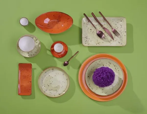 En rik kollektion av handdekorerad porslin i fem livfulla färger. Kombinera krämfärgade, orange, blå, grå och olivgröna delar för att skapa ett unikt och överraskande utseende på bordet, och maten kommer att se lika bra ut som den smakar. Servisen är hållbar och motståndskraftig, designad för att klara den intensiva användningen i ett professionellt kök. Material: vitrifierad porslin. Bränntemperatur: 1050° och 1400°C. Temperaturbeständighet: 180°C