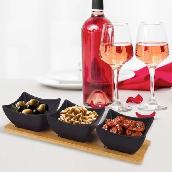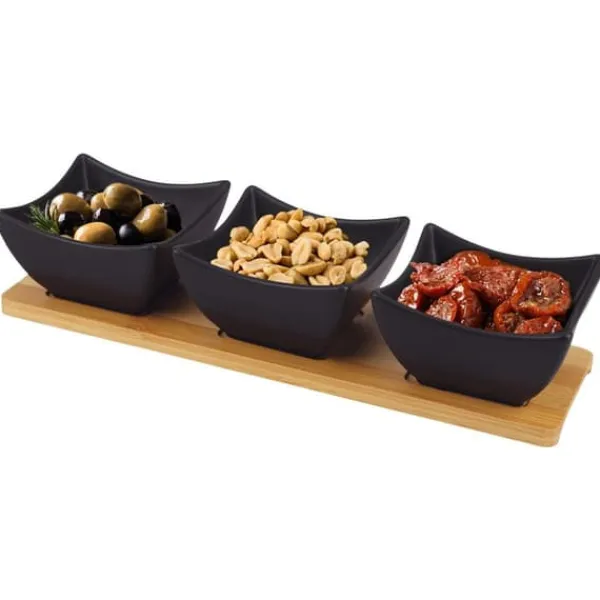 En uppsättning med tre skålar på en bambubricka. De kan användas för att servera snacks, aptitretare, såser och dippsåser. Setet ser vackert ut på bordet. Serverade såser eller snacks placeras praktiskt på ett ställe, vilket gör dem lätta att bära. Skålarna kan användas för familjefester och sammankomster med vänner. De är också användbara för att servera såser under grillfester. Setet är lämpligt för hemma- och professionellt bruk. En perfekt presentidé, till exempel för en inflyttningsfest. Originalprodukt från det tjeckiska märket Orion. Tillverkad i enlighet med europeiska standarder.