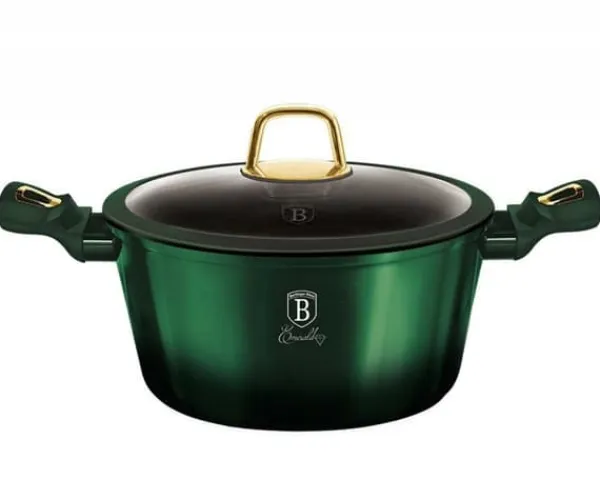 BERLINGER HAUS EMERALD GRYTA OCH FLÄKTSET. Köksredskap ingår. Grytor, kastruller och tillbehör från EMERALD METALLIC LINE-serien från BERLINGE RHAUS är tillverkade av högkvalitativt smidet aluminium täckt med en titanbeläggning med en mycket hög hårdhetskoefficient. Den yttre beläggningen är grön med en karakteristisk metallisk glans. Dessa snygga och fashionabla rätter är som standard utrustade med SOFT TOUCH-handtag (silikonhandtag). Lämplig för alla typer av spisar: gas, el, keramik, halogen, induktion. TURBO INDUCTION-systemet (de värms upp väldigt snabbt) gör att du kan spara upp till 35 % energi. Setet innehåller: gryta med lock, diameter 24 cm, höjd 11,8 cm, kapacitet. 4,1 liter, gryta med lock, diameter 20 cm, höjd 10,4 cm, kapacitet. 2,5 liter, stekpanna med en diameter på 24 cm, höjd 4,8 cm, Stekpanna med en diameter på 20 cm, höjd 4,5 cm, hålslev, köksspatel, slev, visp Egenskaper: Trippel non-stick granitbeläggning Material: hög- kvalitet gjuten aluminium Soft -Touch Handle: silikonhandtag Glaslock passar även till stekpannor TURBO INDUCTION system (mycket snabbt värma upp) 35 % energibesparing Tål diskmaskin För alla typer av spisar: gas, el, keramik, halogen, induktion Färg: grön Redskap av termoplastisk nylon som är resistent mot höga temperaturer Hållbara kokkärl i gjutet aluminium gör att du kan laga mat utan att fastna och med lite fett. Titanskiktet gör kastrullerna extremt reptåliga. Du kan förbereda läckra och hälsosamma rätter i dem som inte kommer att förlora sin saftighet och näringsvärde. De är lämpliga för alla typer av spisar: gas, elektrisk, keramik, halogen och induktion.