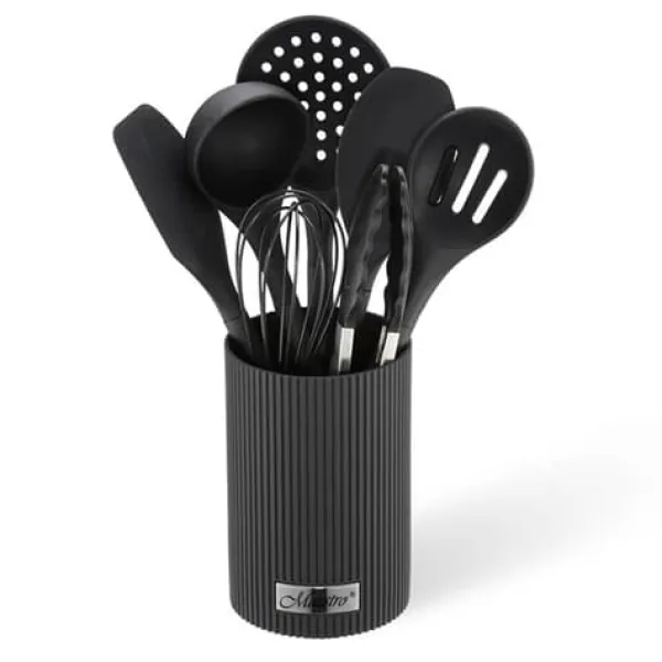Upptäck vårt Maestro MR-1542-BLACK 8-delade köksredskapsset i silikon, perfekt för alla matlagningsentusiaster. Detta set, bestående av åtta viktiga verktyg, är tillverkat av högkvalitativa material som kombinerar flexibel silikon med en hård kärna för hållbarhet och komfort. Setet innehåller: 2 spatlar, en skimmer, en hålslev, silikontång, en slev och en visp, samt ett elegant ställ som gör att du enkelt kan förvara redskapen inom räckhåll. Alla delar har en ergonomisk form och en modern svart design, vilket gör dem till ett perfekt tillskott till alla kök. Maestro-redskapssetet är inte bara praktiskt, utan också ett utmärkt sätt att ge ditt kök ett elegant utseende. Perfekt för professionella kockar och amatörer som värdesätter kvalitet och estetik i vardaglig matlagning. • 8-delat köksset • material: plast – silikon + hård kärna • spatel – 2 st; skimmer • hålslev; silikontång • slev; visp • ställ