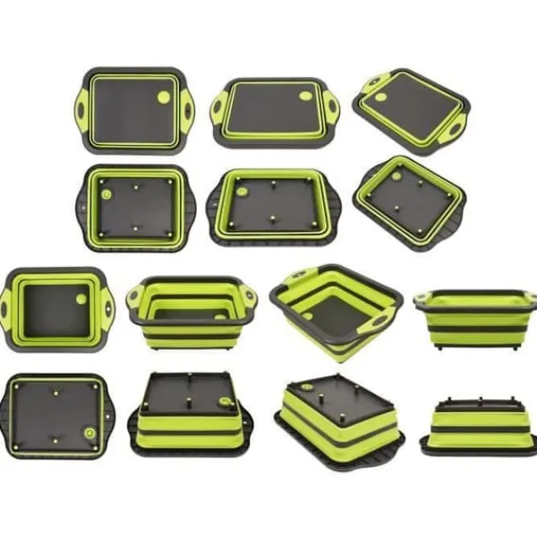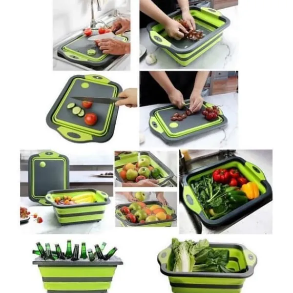 . Material: PP + TPR av livsmedelskvalitet, BPA-fri, icke-toxisk. Dim. som skärbräda (med kant): Längd 42,5 cm – bredd 30,5 cm – höjd 3 cm. Dim. utfälld: sil/kolander/korg: Längd 42,5 cm – bredd 30,5 cm – höjd 9,5 eller 15 cm. F