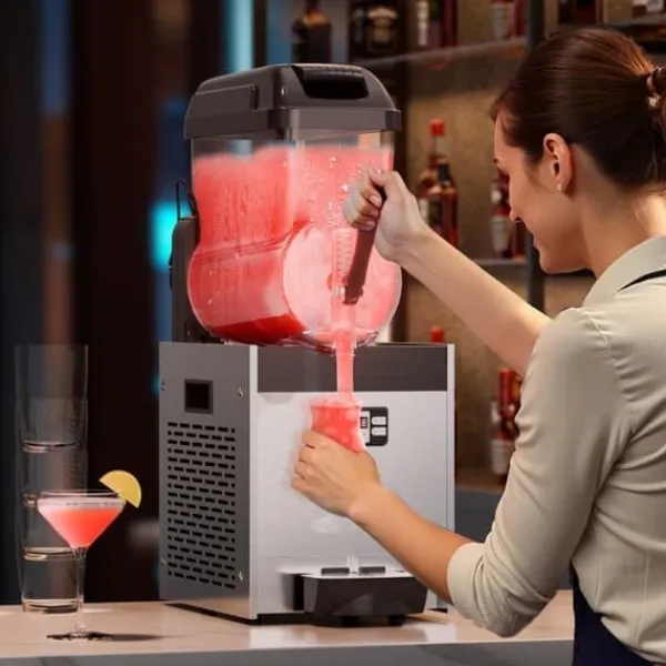 För olika drycker: Denna uppgraderade kommersiella slushmaskin har ett justerbart temperaturområde på 5 ~ 59 ℉ / -15 ~ 15 ℃, vilket ger dig möjlighet att kontrollera mjukheten eller hårdheten på dina drycker. För kalla drycker: 3 ~ 5 ℃ / 37,4 ~ 41 ℉; för alkoholfria slushies: -3 ~ -1 ℃ / 26,6 ~ 30,2 ℉; för alkoholhaltiga drycker: -12 ~ -6 ℃ / 10,4 ~ 21,2 ℉. (Rekommenderad sockerhalt: cirka 13 %, alkoholhalt: under 13 %). Den är idealisk för att skapa ett brett utbud av drycker som juice, te, margarita och iskaffe.
