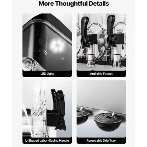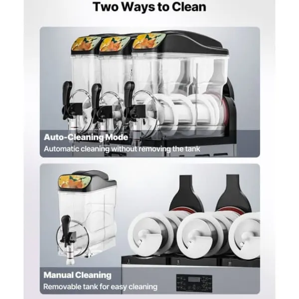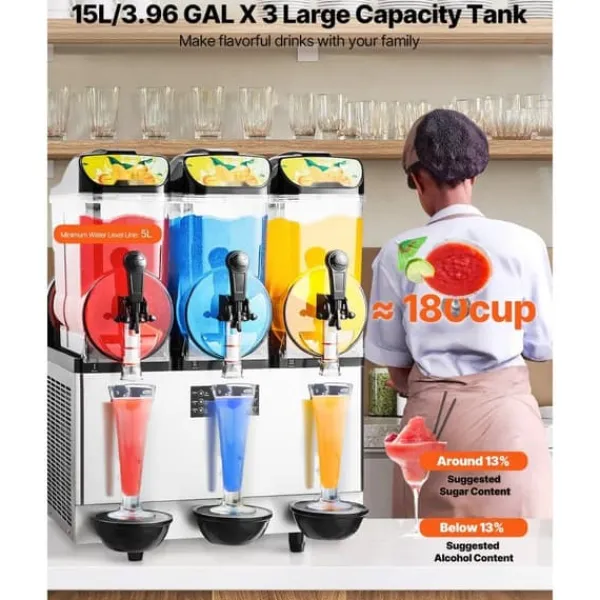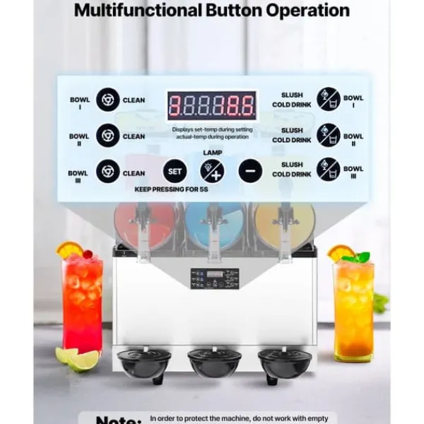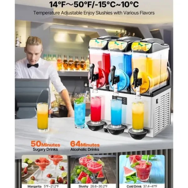 Denna uppgraderade kommersiella slushmaskin har ett justerbart temperaturområde på 14℉ ~ 50℉ / -10℃ ~ 10℃. Det gör det möjligt att kontrollera mjukheten eller hårdheten på dina drycker. För kalla drycker: 3~5℃/37,4~41℉; för alkoholfri slush: -3~-1℃/26,6~30,2℉; för alkoholhaltiga drycker: -15~-6℃/5~21,2℉. Rekommenderad sockerhalt är cirka 13 % och alkoholhalt under 13 %. Slushmaskinen är perfekt för att göra juice, te, margarita och iskaffe.