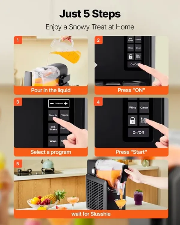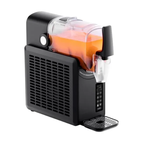 De fem förinställda programmen anpassar tid och kyla för milkshakes, vin-slushies, cocktails, kaffe-slushies och dagliga isdrycker. Häll i vätskan, välj program och låt maskinen göra jobbet — inga isbitar behövs. För bästa resultat: sockerhalt över 6 %, och vid alkoholhaltiga recept 4–16 % alkohol.