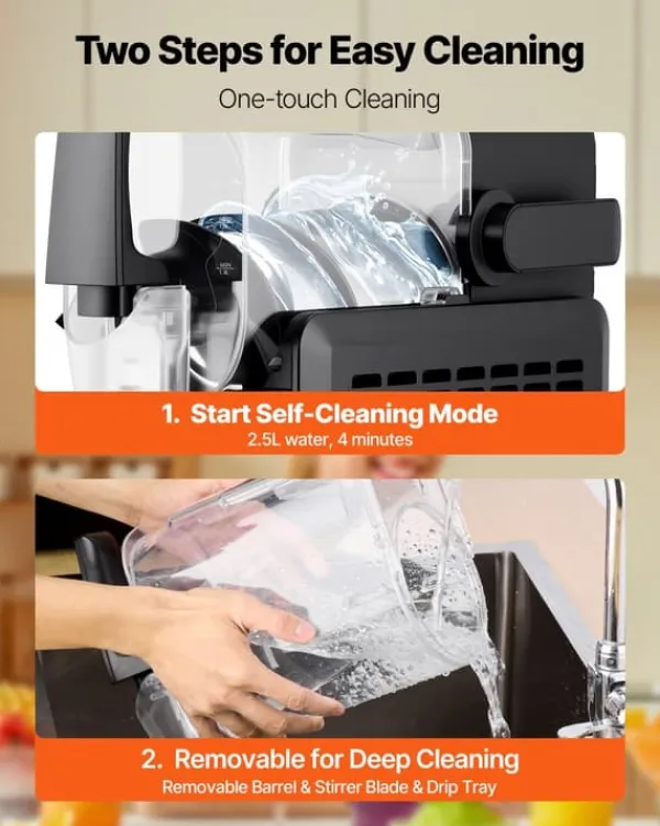 Starta självrengöringsläget för snabb vardagsrengöring. För djuprengöring: lås upp bakre handtaget, ta ur cylindern och lösa delar och skölj med vatten eller placera i diskmaskin. Den avtagbara droppbrickan fångar upp spill och förenklar städningen.