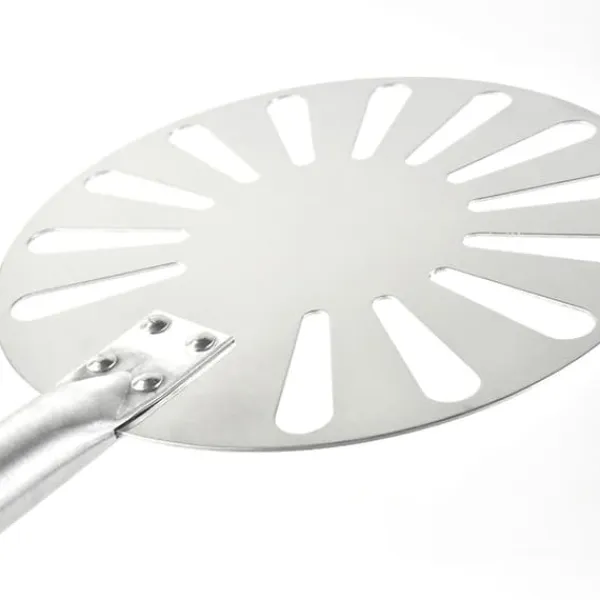Tillaga dina pizzor till perfektion med en snurrspade. En rund pizzaspade förenklar processen att vända och snurra på pizzan så att den tillagas jämt i ugnen. Håll pizzorna i kontakt med den varma ugnen när du snurrar dem som ett proffs med din pizzaspade. Perforeringarna i spaden låter överflödigt mjöl falla bort för en perfekt tillagad pizzabotten.