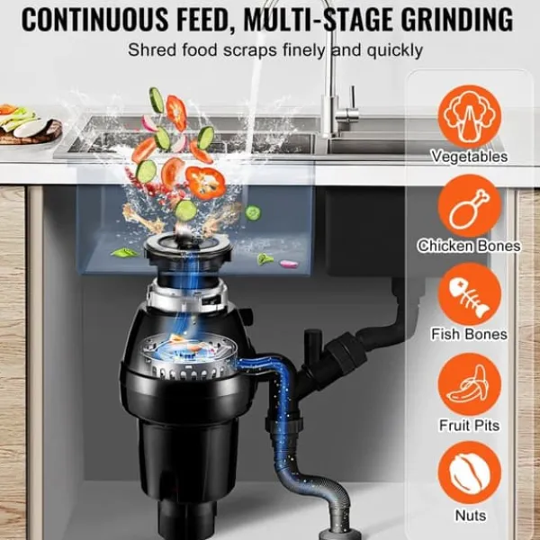 - Minskar ljudnivån: Med tre lager av brusreducering, inklusive ljudisolerad bomull, stänkskydd och ett tjockt ABS-skal, ger denna matavfallskvarn en tystare slipupplevelse. Det minimerar störningar och säkerställer en lugn drift.