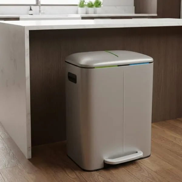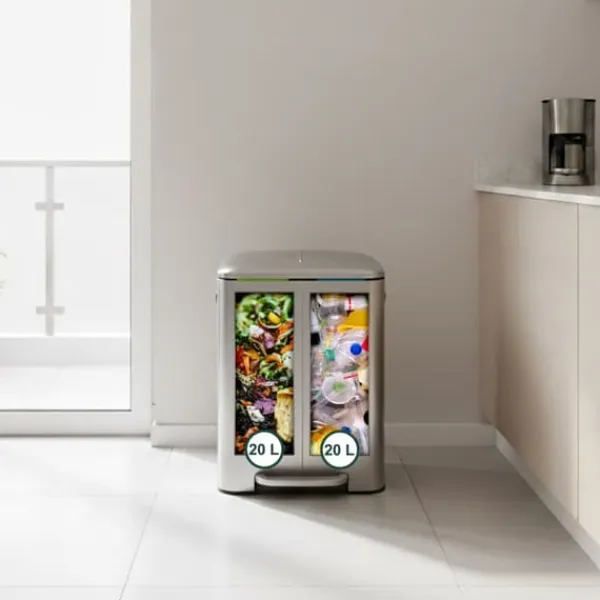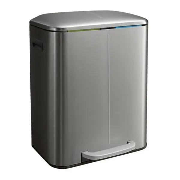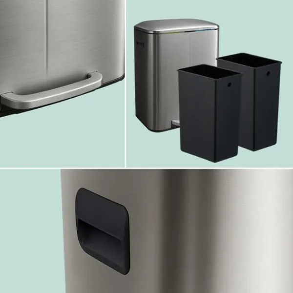 Denna 2-facks avfallssorteringsbehållare erbjuder en effektiv lösning för sortering av förpackningar, papper, organiskt avfall eller restavfall hemma. Den har en hygienisk fotpedal för handsfree öppning av locket, mjukstängande lock och avtagbara innerbehållare för enkel tömning, vilket kombinerar funktionalitet med modern design.