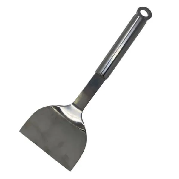 Spatel i rostfritt stål med ergonomiskt handtag, perfekt för grill och barbecue. Värmebeständig och hygienisk, den erbjuder optimal komfort och enkel användning. Dess robusta konstruktion garanterar lång livslängd, även efter upprepade användningar. Lätt att rengöra, den behåller varken lukt eller smak.