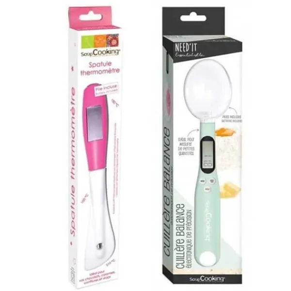 Ideala inom bakning såväl som matlagning, denna balansked och denna termometerspatel gör det möjligt att kombinera praktisk användning och precision i dina kulinariska förberedelser. Du kan enkelt väga alla dina ingredienser med den ultraprecisa balanskeden upp till 300 gram: mjöl, socker, jäst… Den möjliggör också konvertering från gram (g) till uns (oz). Den stänger av sig automatiskt efter 30 sekunder. 2 batterier ingår med skeden. Mått på skeden: L 26 cm x B 8 cm x H 3,5 cm. När det gäller den elektriska termometerspateln, så gör den det möjligt att arbeta med kola och temperera choklad tack vare sitt silikonspatelhuvud. Batteri ingår. Huvudet med spatel är avtagbart, så du kan använda termometern ensam.