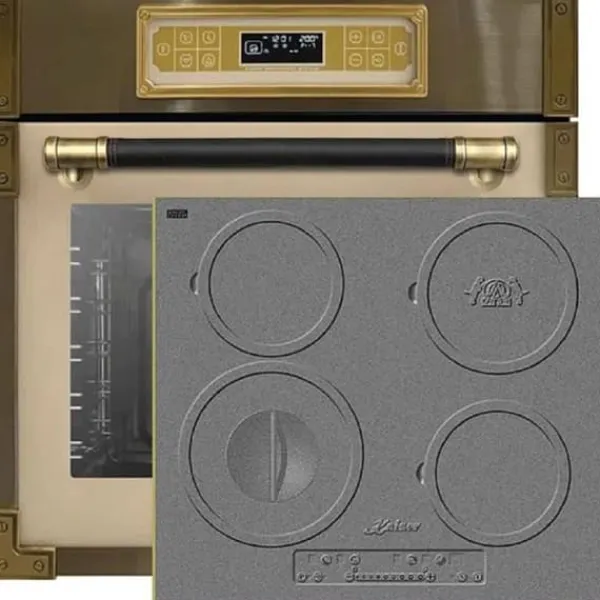 Typ av ugn: Multi 10 XXL multifunktionell elektrisk ugn med självrengöring DESIGN Induktionsspis med exklusiv autarkisk design med smalt ”Antique Gold” ram.
