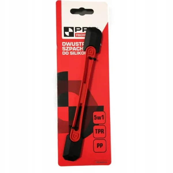 PRO DUBBELSIDIG SILIKONSPATEL gjord av starkt konstruktionsmaterial två spetsar med fem olika profiler avsedda för efterarbete i plattsättningsspetsar av mjuk flexibel polymer (TPR – termoplastiskt gummi) skadar inte kanter eller repar arbetsytans ergonomiska design vilket säkerställer ett bekvämt grepp.