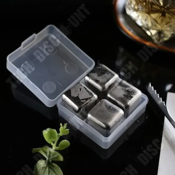 Set med 4 isbitar i rostfritt stål för whisky, som mäter 26 x 26 x 26 mm. Lätta att använda och återanvändbara, de säkerställer optimal kylning utan utspädning. Perfekt för att njuta av din whisky, bourbon eller scotch.