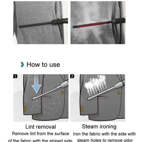- Tar bort ludd och stryker textilier med ånga – två funktioner i ett