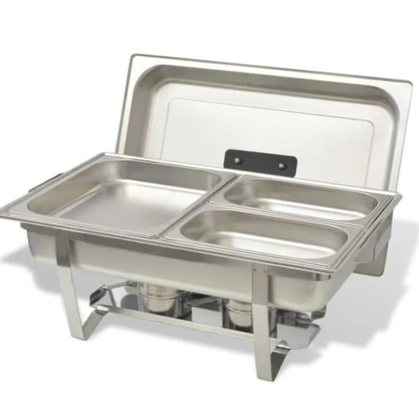 Denna uppsättning varmhållningskärl är tillverkad i högkvalitativt rostfritt stål, har en stadig konstruktion och är enkel att rengöra. Matkärlen har ”Gastronorm” standardmått, vilket tillåter en universell användning och ett brett utbud av kombinationer. Vattenbadet och matkärlen har rundade hörn för enkel rengöring. Locken har ett värmeisolerat handtag och kan praktiskt placeras på stativet tack vare 2 integrerade krokar. Hållarna har två handtag vilket gör varmhållningskärlen enkla att flytta på. Stativen har dessutom en hylla att ställa brännarna på.