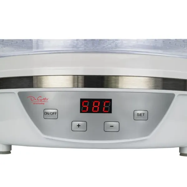 LED-displayen informerar om den aktuella temperaturen inuti torktumlaren, vilket möjliggör exakt kontroll över hela processen. Instruktionerna som medföljer produkten beskriver hur du bäst torkar enskilda produkter så att du kan njuta av läckra, hälsosamma och hemlagade snacks.