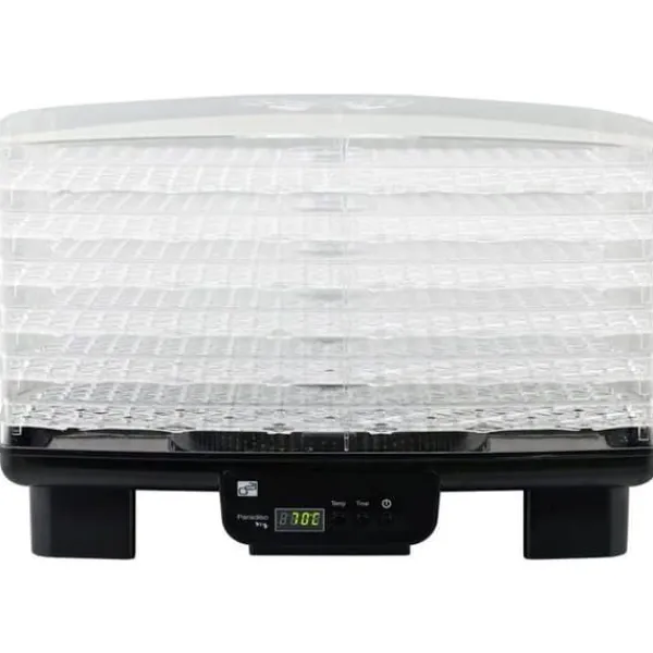 Frukt- och grönsakstork – effekt 550 W för torkning av 6 brickor, brickmått 43 cm × 29 cm (L × B), digital kontroll, automatisk avstängning, med timer, temperaturinställning från 40 till 70 °C, genomskinlig lock, med skärm, touchkontroll, vertikal luftflöde, plastbrickor, materialet i torken är plast, mått 21,5 × 43,5 × 29,5 cm (H × L × B)