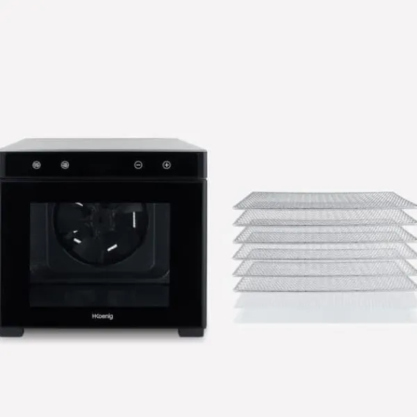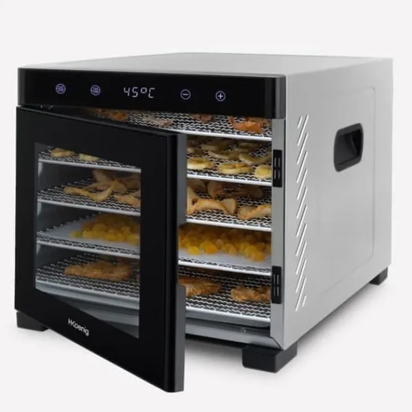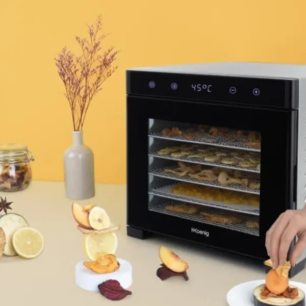 HKOENIG DSY900 mattorkare är den idealiska enheten för att tillaga torkad frukt och grönsaker. Bevara alla smaker och näringsfördelar med din mat och njut av dem även under lågsäsong. Denna dehydrator torkar alla typer av mat: frukt, grönsaker, svamp, fisk, kött eller aromatiska örter.